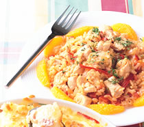 白饭4碗,鸡肉丁1公斤,洋葱末1个,蒜头末1个,红甜椒丝1个,蕃茄丁400公克,荷兰芹末少许,高汤200cc,番红花粉少许,精緻橄榄油3汤匙,红椒粉少许,盐少许,胡椒粉少许,白葡萄酒200cc,柳橙切片1/2个