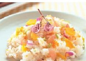 3.将寿司饭盛入盘中,撒上虾卵、鸭儿芹丁,再把作法2的材料均匀撒上,上方可装饰盐渍樱花花瓣,更添春天气息。