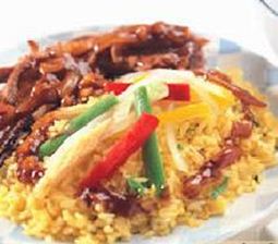 4. 热油锅,将作法1的小羊排煎熟,加入作法3的材料与太白粉水、沙茶酱、酱油、鲜鸡晶、水一起煮开后盛起,淋在黄金炒饭上即可食用。