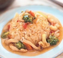 糙米饭90公克,红萝卜15公克,白花椰菜15公克,绿花椰菜15公克,柳松菇适量,水200cc,玉米粉1小匙,水10cc,盐1/2小匙,橄榄油1/2小匙,味醂1/4小匙