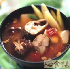 乌鱼1尾,辣味肉酱罐头1罐,新鲜香菇100公克,蕃茄200公克,豆腐2块,蒜苗2根,水4杯,盐1/2大匙