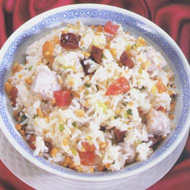 3.将虾米、腊肉、中芹及青蒜炒好调味,加入芋头和熟饭同炒,饭热后加花生再炒片刻即成。