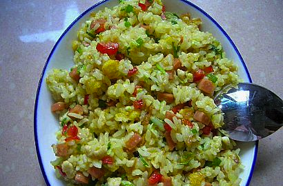 3、待饭炒散、炒干(软硬依个人口味决定)后放盐(盐不能多放,因为鸡肉粒和火腿肠都有盐的),将青、红椒,鸡肉粒,火腿肠,大白菜,全部倒入翻炒,炒约一分钟后加鸡精、咖喱粉铲匀,起锅前倒入碎葱、香菜,再炒匀后起锅。