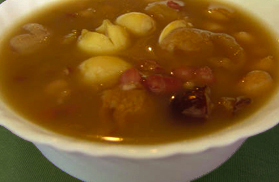 2.糯米加水煮成稀粥,再加入其他原料,以白糖调味即可。