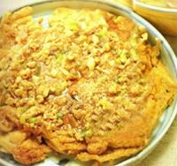 2、把油放入锅中加热,把蛋汁到入锅中,先用大火烘,再用小火烘3分钟,此时蛋皮两边会渐渐膨高,如果中间没有膨起,可以另放一勺油淋在中间,盖上锅盖,使蛋全部膨高后,小心用锅铲翻面,待两面呈金黄色,即可放在盘中,再切成2公分块状。