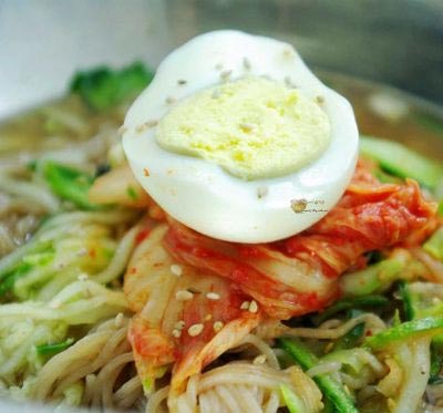 5.筛走冰粒,放入调好的汤汁放上黄瓜丝,泡菜和鸡蛋撒上芝麻即成,全程约10分钟。
