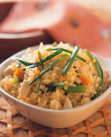 (3)将咸蛋丁、调味料拌入米中,一起煮熟。开关跳起后,将韭菜花段放入,盖上锅盖再焖15分钟,最后用饭匙由下往上轻轻拌匀即可食用。