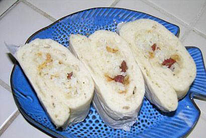 7.象卷寿司一样把有饭的一边面团向另一边卷去,尽量卷实.