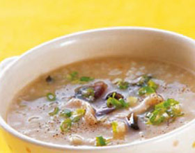 主料:粳米100克,松花蛋(鸭蛋)160克,淡菜(干)50克,