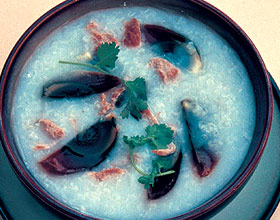 主料:粳米150克,蚝豉100克,松花蛋(鸭蛋)75克,叉烧肉200克,调料:盐2克