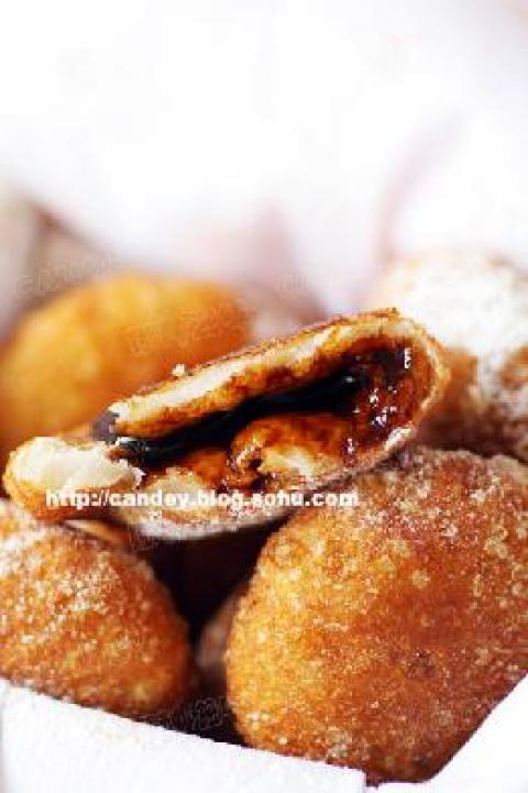 4、揪一个小剂子包入豆沙,入油锅炸至金黄即可。