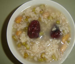 主料:小米200克,大米100克,绿豆50克,花生米50克,红枣50克,核桃仁50克,葡萄干50克,红糖或白糖适量。