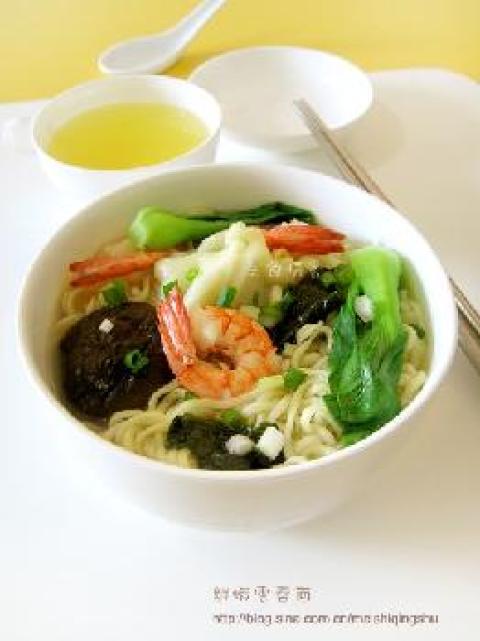 面条,青菜,紫菜,香菇,高汤,香葱,馄饨,大虾,盐,鸡精,胡椒粉,香油