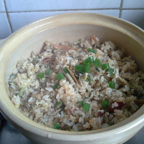 心得:在饭将煮到水将干时,开盖,沿沙锅的周边倒入2-3匙油,再盖上盖小火煮2分钟至闻到香味即停火,这样可以使饭味更香,还可以品尝到香脆的锅巴呢
