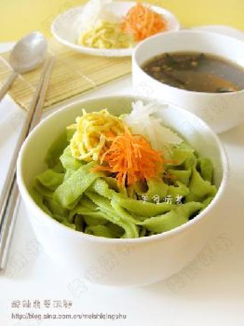 4.将刚才和好的菠菜面团擀成圆片,对折两次后切成面条,中间可撒上些玉米面,防止面条粘连,将做好的面条下入开水锅中煮熟,捞出过凉,或用油拌匀晾凉,不要用生油哦,最后摆上面码,较上酸酸辣辣的调味汁就可以了。