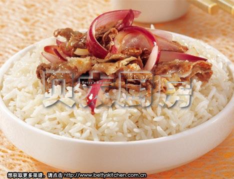 新鲜肥牛肉片250g,洋葱1/4个,盐1茶匙(5克),白砂糖1茶匙(5克),生抽1汤匙(15ml),白米饭1碗(最好是刚焖好还带着热气的)
