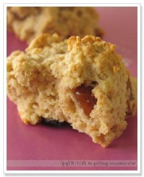 1杯全麦面粉1杯,1杯白面1杯,1大勺(tbs)泡打粉1大匙,6大勺(tbs)有机黄油6大匙,1杯低脂牛奶1杯,1大勺(tbs)白糖大匙,1把葡萄干适量,半小勺(tsp)盐0.5小匙