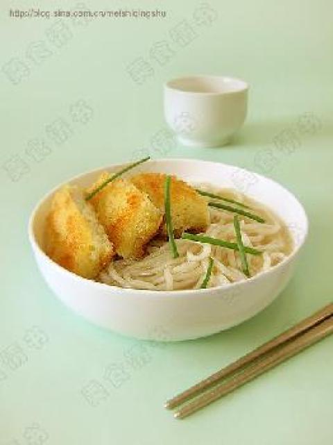 面条150克,净鱼肉100克,葱段10克,青菜适量,盐,料酒,面粉,鸡蛋,面包粉,高汤(最好不要用清水代替),葱姜汁