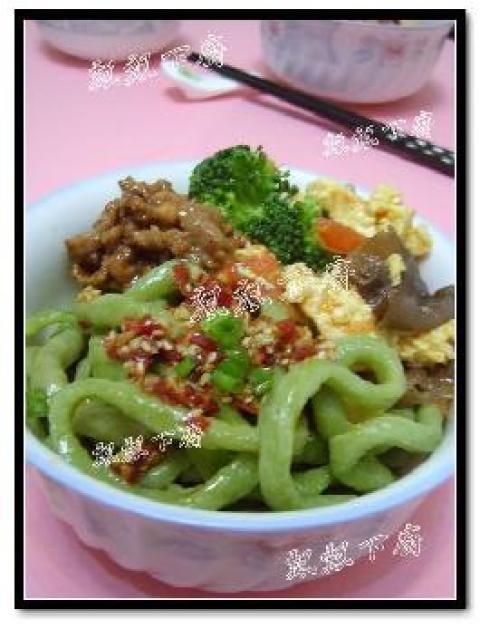 中粉500克,菠菜汁,盐2小匙,辣子,西红柿,木耳,炒蛋,西兰花,肉丝