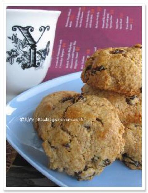 全麦低筋面粉2杯,柠檬皮丝儿0.5个,全脂有机牛奶0.6杯,红色葡萄干0.6杯,鸡蛋1个,无盐有机黄油4大匙,盐0.25小匙,泡打粉2.5小匙,砂糖1大匙