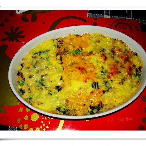 6.将作法5的焗烤料平铺在作法2的米饭上,撒上起司丝,再将烤皿放置于烤盘上,另在烤盘上加入半碗水,并放入已预热至200℃的烤箱烤至表面呈金黄色即可。