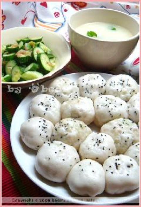 面200克,酵母粉2克,水110克,盐,生抽,胡椒粉,芝麻