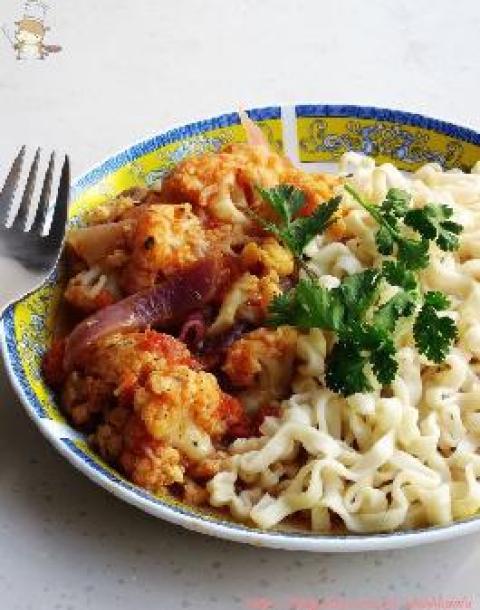 伊面1包,菜花0.5个,蕃茄2个,洋葱0.5个,香菜适量,橄榄油1小匙,盐1小匙,蕃茄酱1大匙,黑胡椒0.125小匙,淡奶油30毫升,清汤1碗,意大利混合香料适量