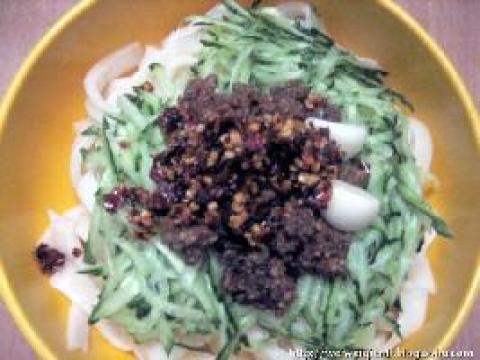 3.加上黄瓜丝、肉酱、蒜、辣椒、醋就可以吃啦!!!!!