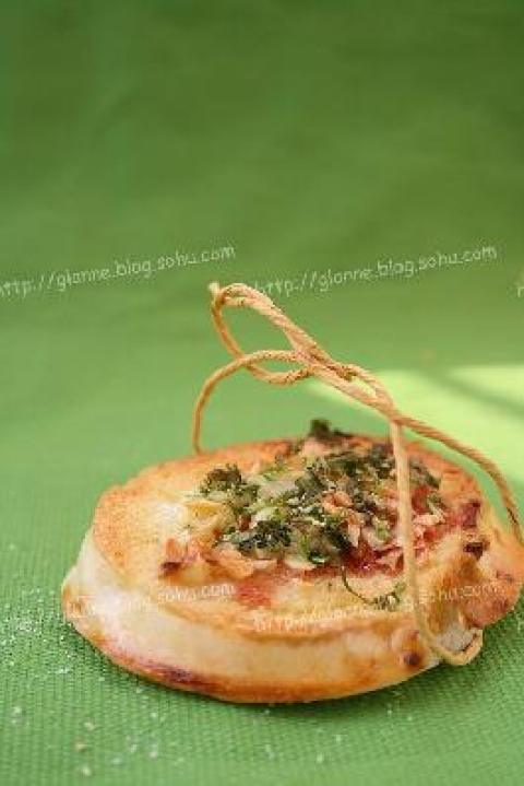 3.然后在馒头片上再涂上叉烧酱等自己喜欢的酱料,或者是撒上蒜末,最后撒上适量法香末;
