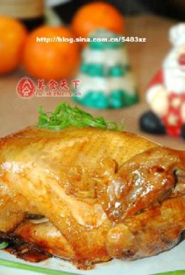 8、用锅里的汤料,再把鸡整个刷一次,然后在表面刷上一层蜂蜜,再次按下煮饭档,待跳档后再闷几分钟就ok了。(下图就是成品,漂亮吧。)