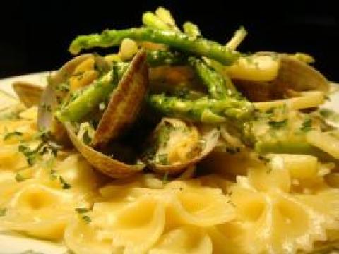 2.面约煮5分钟后,另备热锅下油放入葱姜蒜辣椒末爆香后,再放入花蛤烈火快炒,开口后加点黑椒粒,倒入白酒呛锅煮滚后下芦笋段(白的部分),和起司片后改开小火融和。