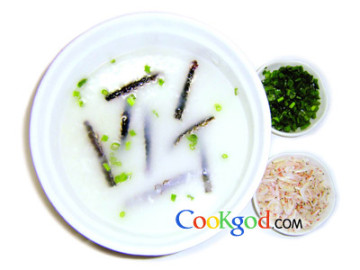 2、将洗好的水晶米连同海蜈蚣、瘦肉、姜丝一起放入沙锅内加鸡汤、1千克水小火熬30分钟至米开花,用盐、鸡精、味精调味,跟用小碟盛装的葱花、虾皮上桌即可。