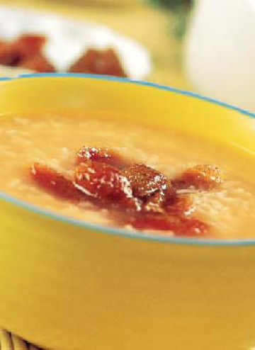 捞出山楂,倒入糯米,继续用中小火煮1小时,最后加入冰糖调味。