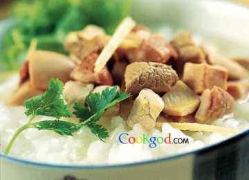 5.将所有材料放入熬好的白粥内,煮熟后用精盐、胡椒粉调味,并撒上生姜丝与香菜末即可。