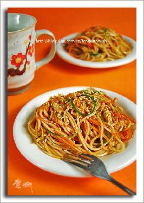 5.大容器中放入面条和双丝,然后就只用老抽3小匙拌匀撒上点熟芝麻即可。不能用生抽哦,太咸也没有甜味就不是我们这款凉面的特色了。