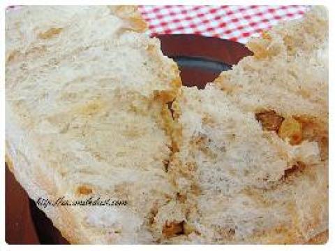 1.全麦粉50克.高粉200克.糖40克.溶化牛油30克.盐半小匙.酵母粉5克.温牛奶120ml.蛋白一个(蛋黄留了刷表面用)核桃(先烤香)和用酒泡过的葡萄干各半杯.牛奶加酵母粉和糖拌溶加入盐.