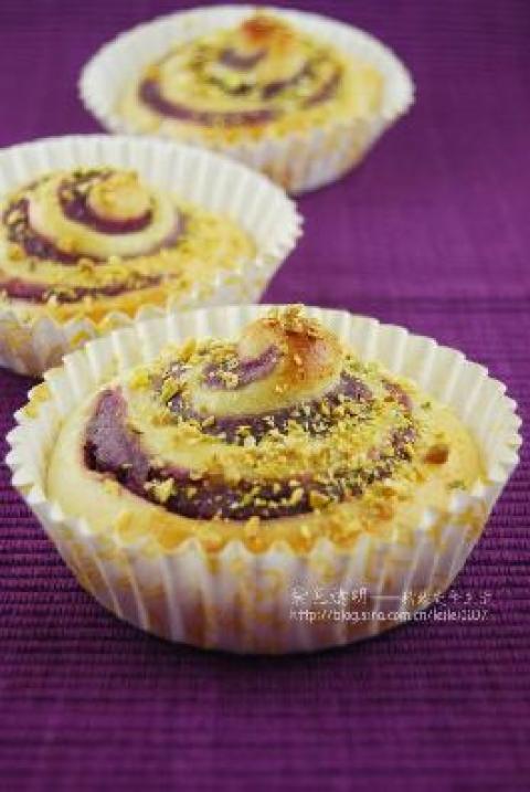 紫薯馅料:,紫薯薯泥300克,细砂糖30克,黄油60克,面包配料:,金像高筋面粉250克,细砂糖40克,盐3克,蛋15克,酵母3克,牛奶150克,黄油25克,表面装饰:,全蛋液,开心果