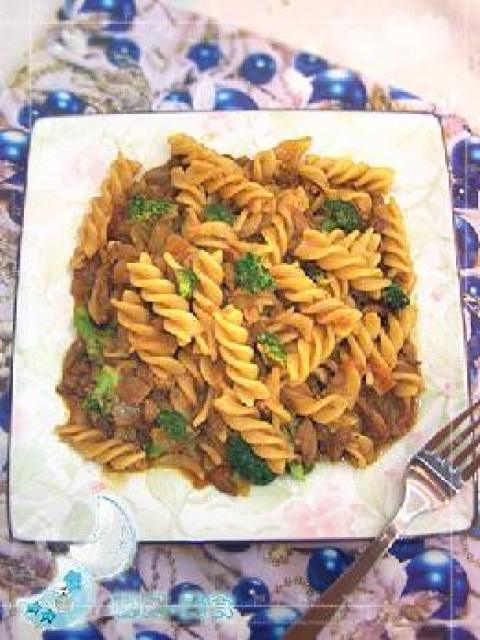 2.洋葱、西兰花、肉末、西红柿加生抽、盐、番茄酱、黑胡椒粉炒熟,将煮好的面加入,翻炒均匀即可。