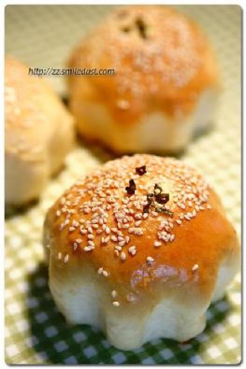 7.收口朝下,面团表面刷一层三花淡奶,然后沾上芝麻。放入模具中,点缀上些葱花。