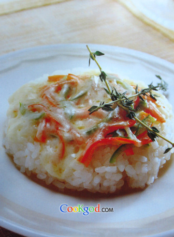寿司饭300克,火腿100克,青红椒各1个,奶酪、美乃滋各适量。