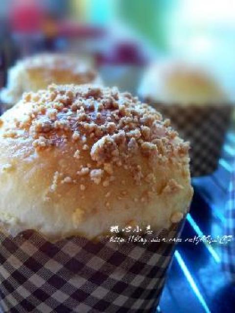 6.面团表面刷上蛋液,撒上酥松粒,放入预热的烤箱内,上火190度下火180度或上下火185度约烤18分钟。