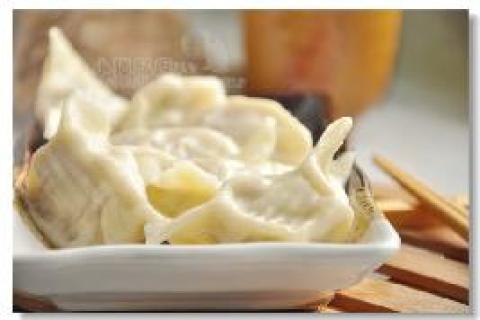 (3)把面团揉成细长圆形,分成12份,每份揉成圆形,用面杖擀成圆形皮,将馅装入,包好,捏严,勿使漏馅,水煮开后,即可下饺子,煮开后,稍加冷水,如此3次,可捞出1个饺子,用手指压按后,能立即复原,表示饺子已熟,即可捞出。食用时可蘸着醋吃。