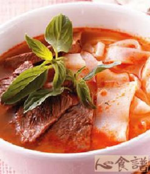 面150公克,青菜适量,熟牛肉150公克,酸辣牛肉汤头500㏄,辣油数滴,盐1/2茶匙,糖1/4茶匙