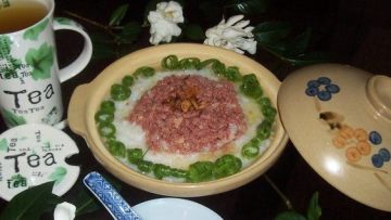 5、把煮稀烂的清粥舀入瓷盖碗里,配南乳猪肉碎佐料和围绕着葱花。把它当早餐配上一杯铁观音~~趁热慢慢吃哦。