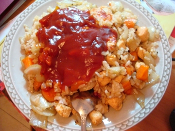 锅中倒番茄酱,加白醋加糖不断的炒,一边尝一边调比例,我个人觉得酸口的比较好吃,炒好番茄酱之后就可以浇在炒饭上啦!绝对超好吃!!但是不要吝啬你的番茄酱和鸡胸肉哦!!