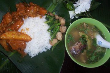 4、再来配上一碗够味的香菇苦瓜汤,让它们搭配成“回归大自然的午餐”。还可以随喜的用手抓咖哩饭送入口....免洗盘碟匙和叉!