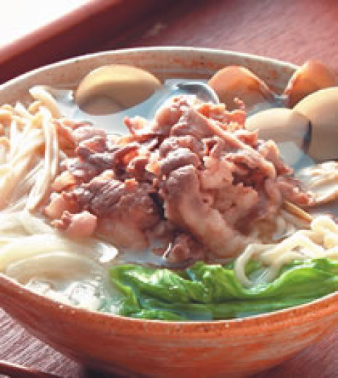 4.将高汤煮至滚沸,放入作法1的蛤蜊、作法2的小白菜段、金针菇、洋葱丝以及盐,煮至蛤蜊张开,倒入作法3面碗内。