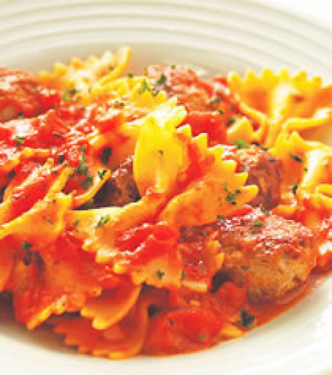 4. 捞起作法3的义大利面条放入作法2中的酱汁锅中继续煮至汤汁稍干后,加入巴西利末拌炒一下,即可起锅装盘。