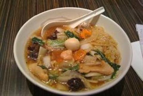 拉面150公克,大骨浓汤500㏄,鱼板3片,肉片5片,蛤蜊3颗,花枝30公克,金针菇20公克,盐1/4茶匙