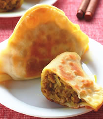 5.锅烧热加入1大匙沙拉油,放入作法4包好的洋葱咖哩盒子,转小火将盒子三面平均烙过,最后盖上锅盖焖约2分钟即可。